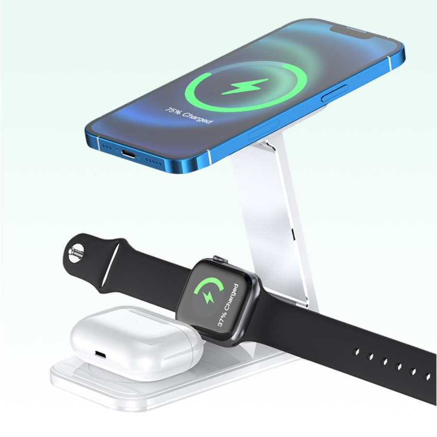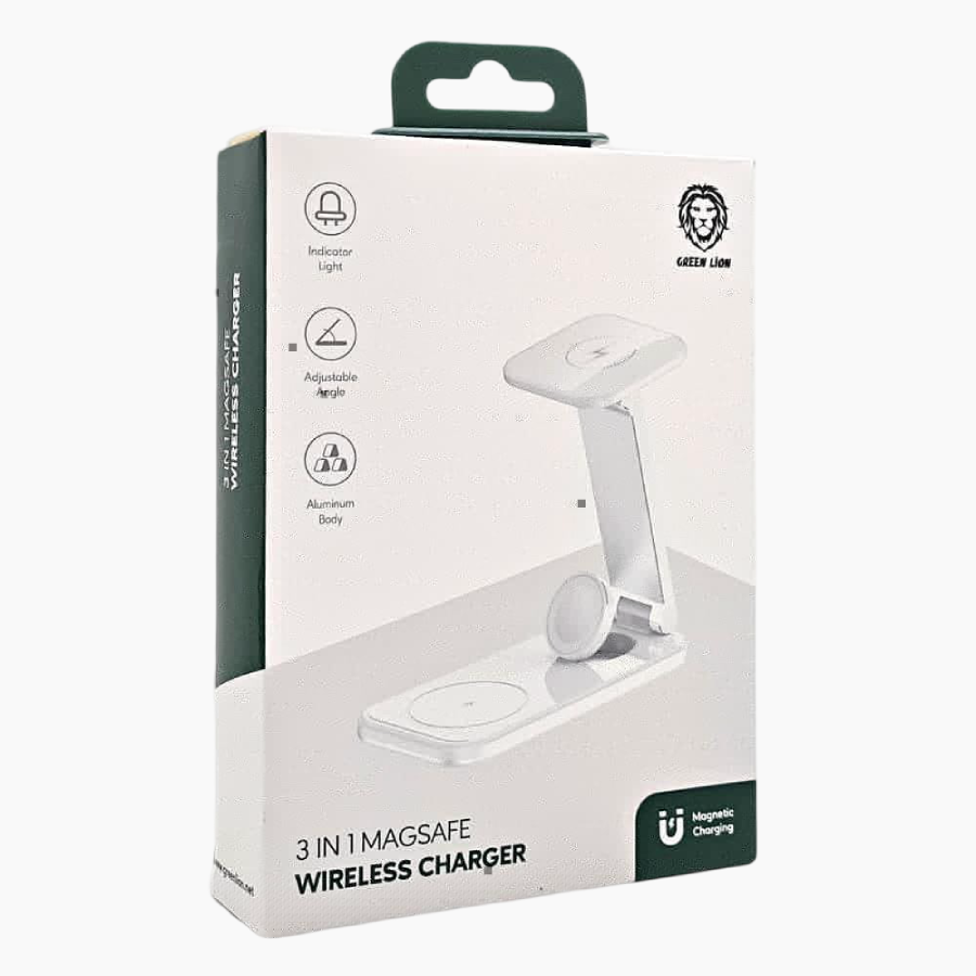 Charge three devices at once with the Green Lion 3-in-1 MagSafe Charger. Sleek, adjustable, and powered by a single Type-C cable—perfect for a clean, stylish setup.