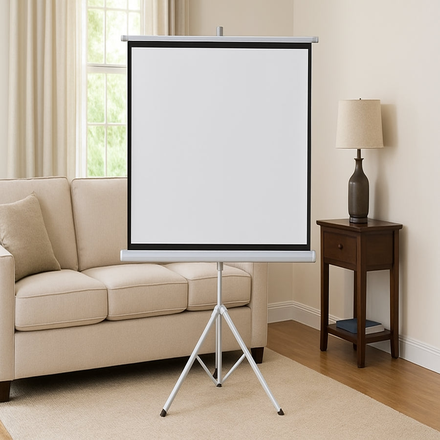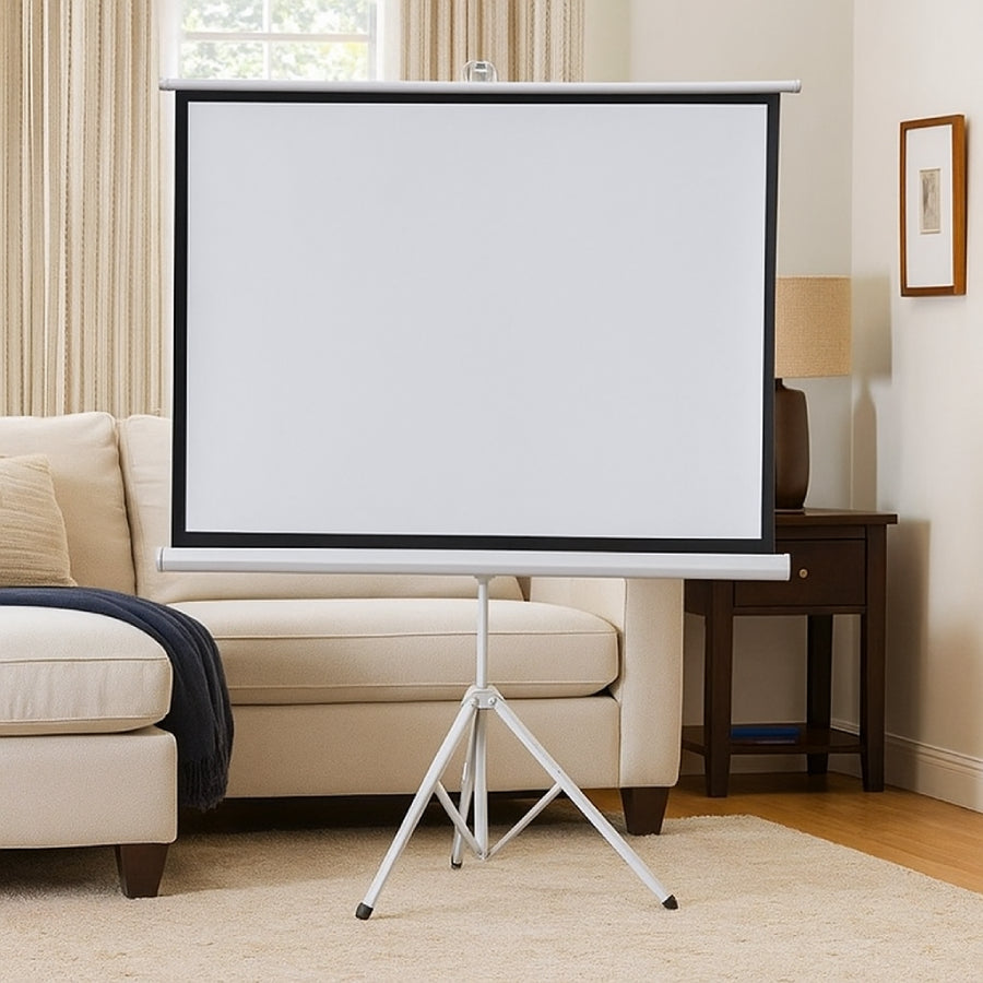 The Green Lion 72″ Portable Projection Screen with wrinkle-free PVC fabric and adjustable tripod delivers bright, clear visuals and easy setup for indoor or outdoor viewing.
