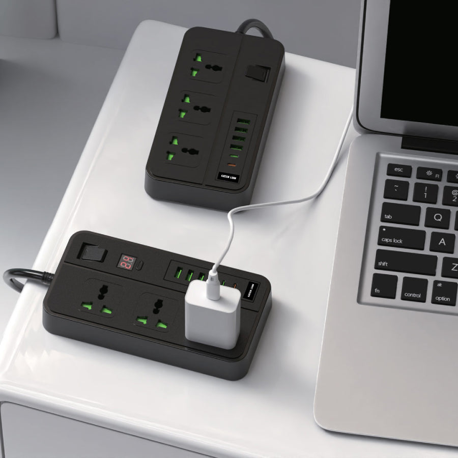 The Green Lion GS-150 Power Socket 3000W features 3 AC outlets, 4 USB-A, 2 USB-C ports, fast charging, child safety, and a 24-hour timer for safe, versatile power management.