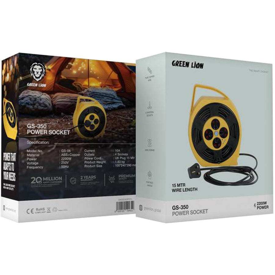 Green Lion GS‑350 Power Socket offers a versatile, efficient solution with 4 universal outlets, 2200W capacity, 250V/10A rating, 15m UK plug cord, durable ABS/copper build, and portable handle for home or travel use