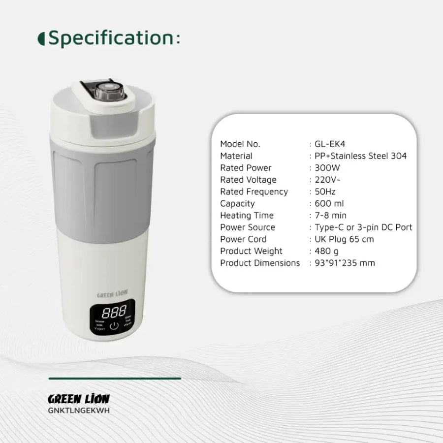 Green Lion Kettle & Go Electric Kettle offers 600 mL capacity, 300W power, quick 7–8 min boiling, 6 preset modes, keep-warm function, touch control, dry-boil protection, and drip-free spout for safe, efficient use.