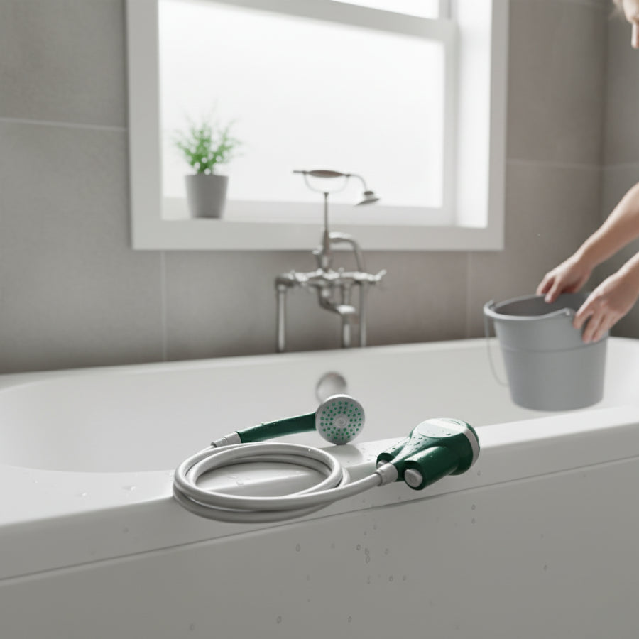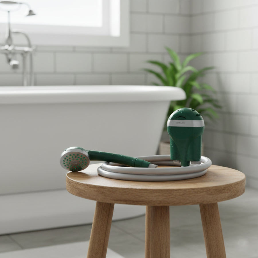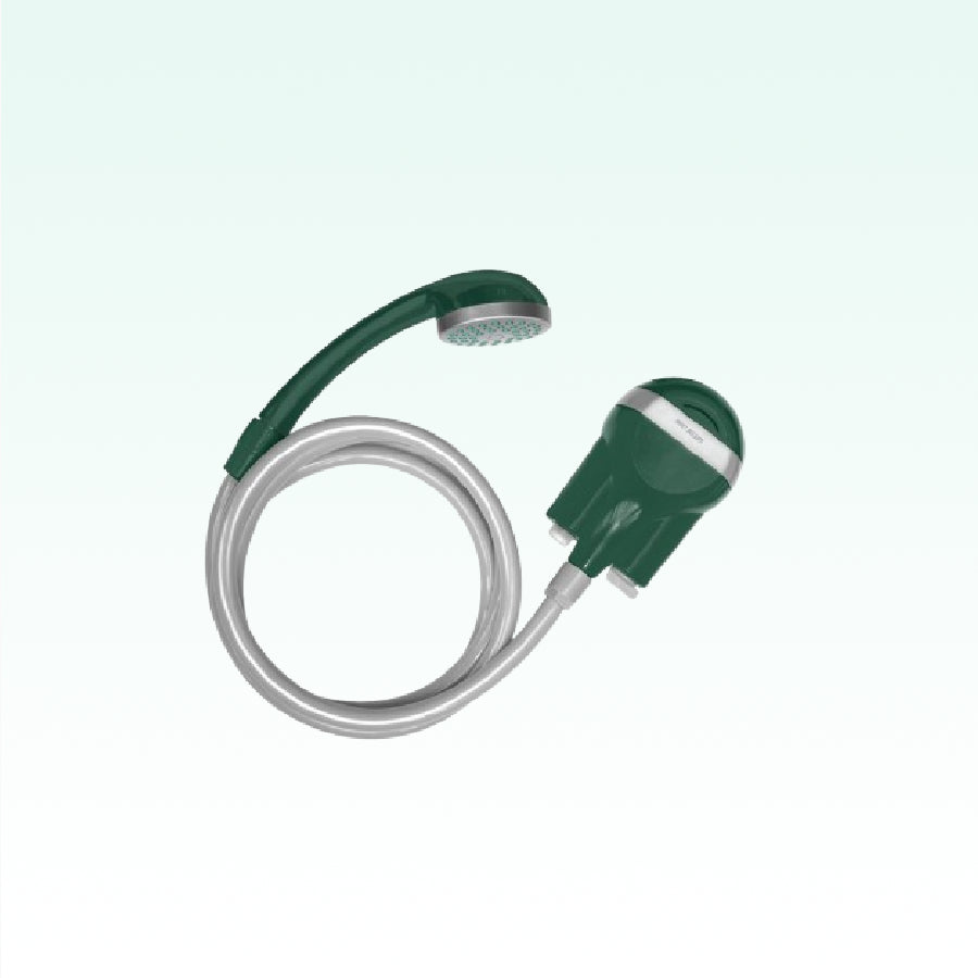 The Green Lion Outdoor Smart Shower features a 600 mAh rechargeable battery, 1.0L/min water flow, 30-minute use, and USB-C charging, offering a portable and eco-friendly outdoor shower experience.