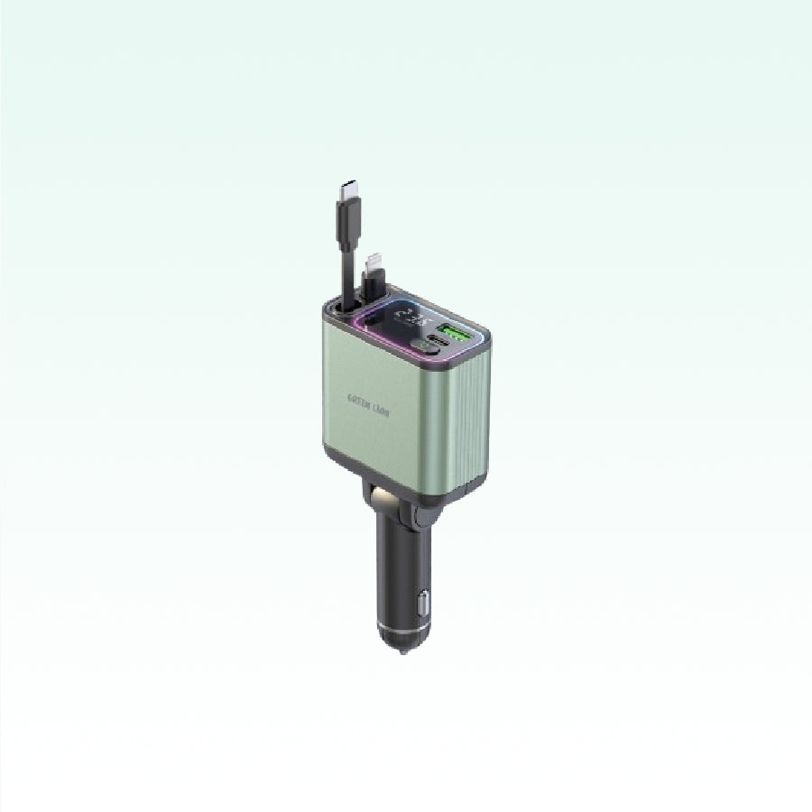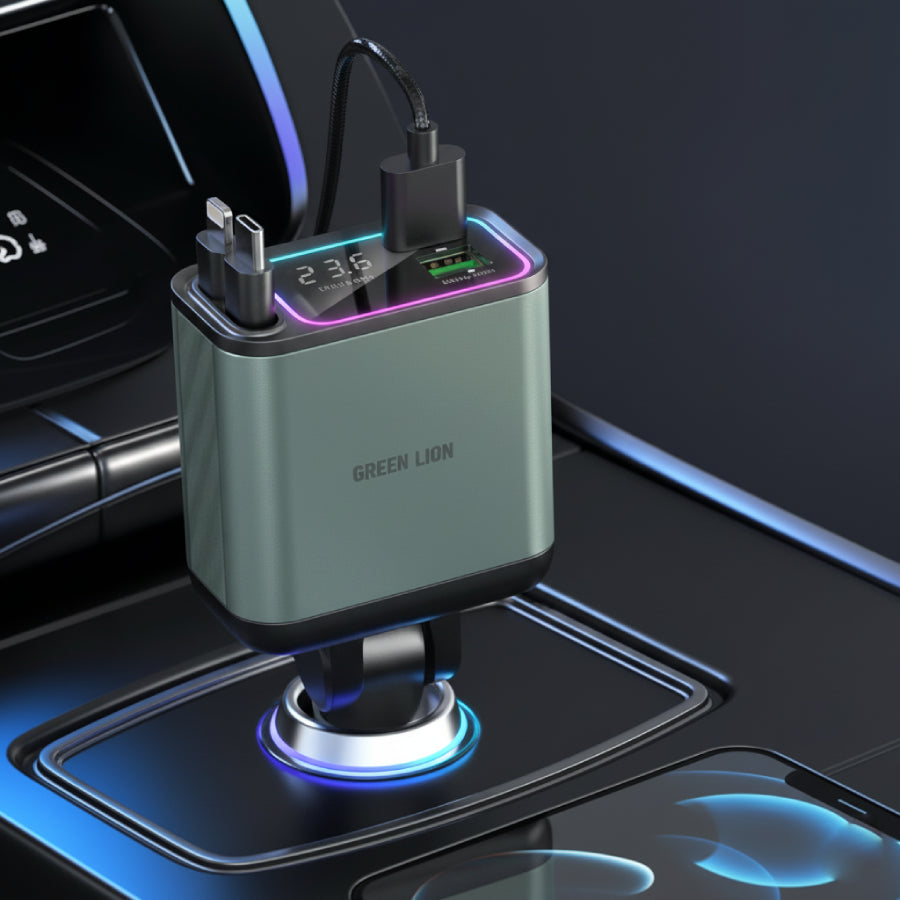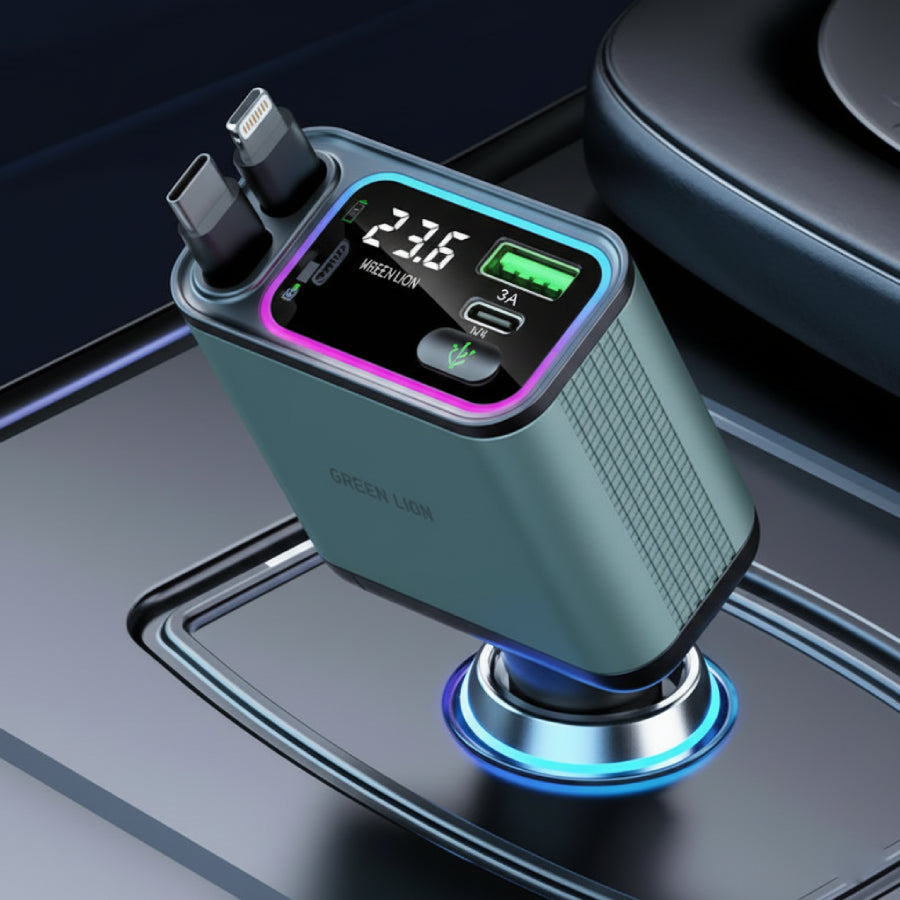 Green Lion Retractable 90W Car Charger keeps your devices powered with dual ports, Type-C & Lightning cables, 90W fast charging, and ambient light for a stylish night drive.