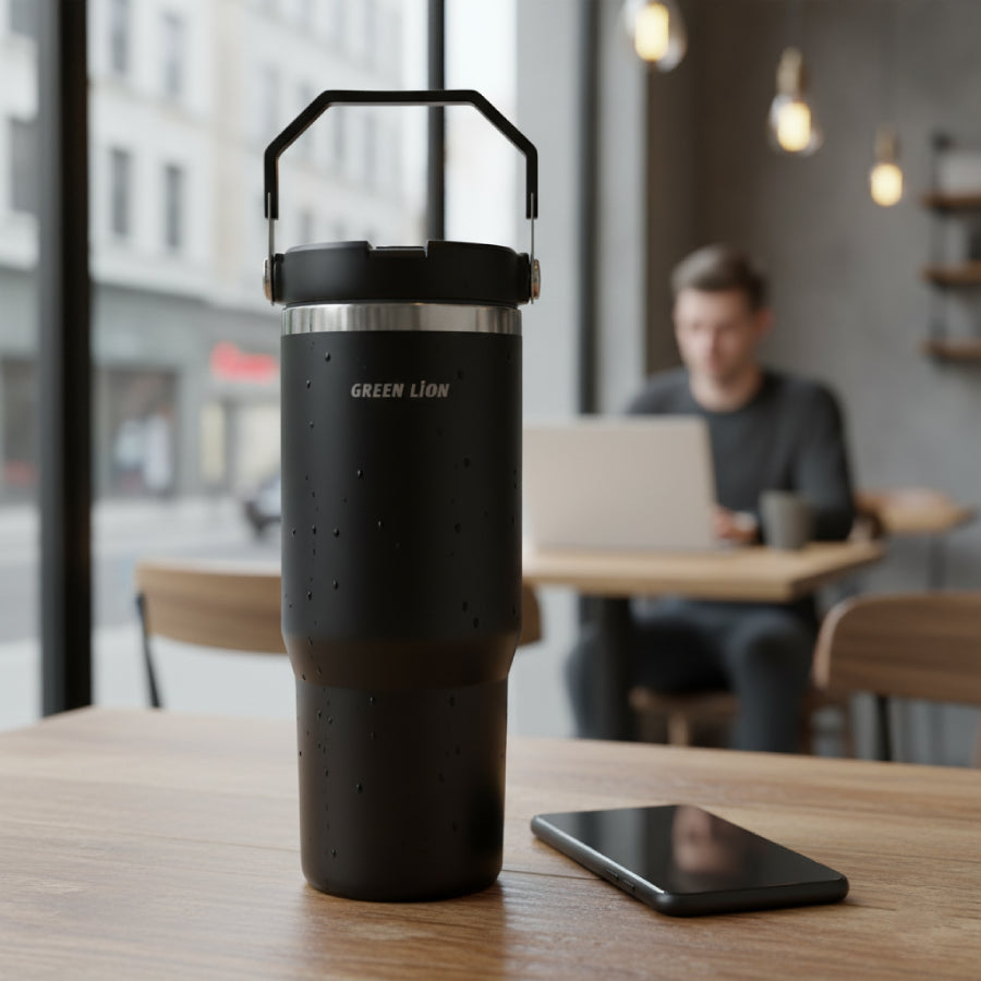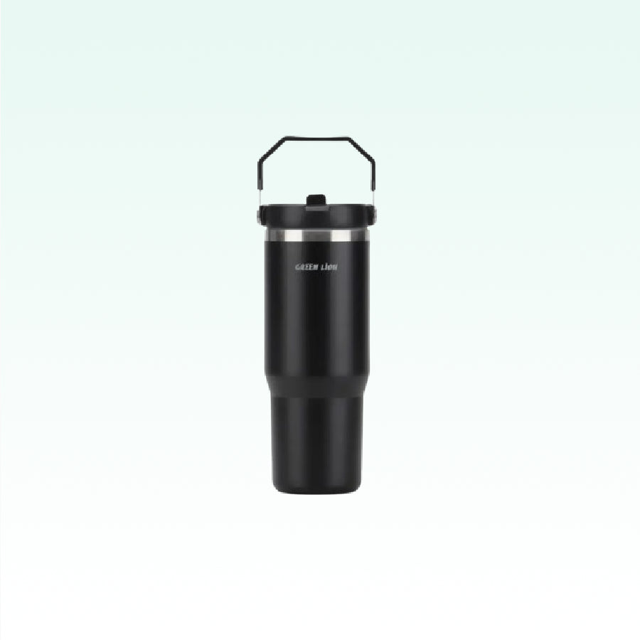 Green Lion Vacuum Tumbler 900ml features durable stainless steel, double-wall insulation to keep drinks hot 12–24 hrs or cold 14–32 hrs, with a flip straw lid and portable handle.
