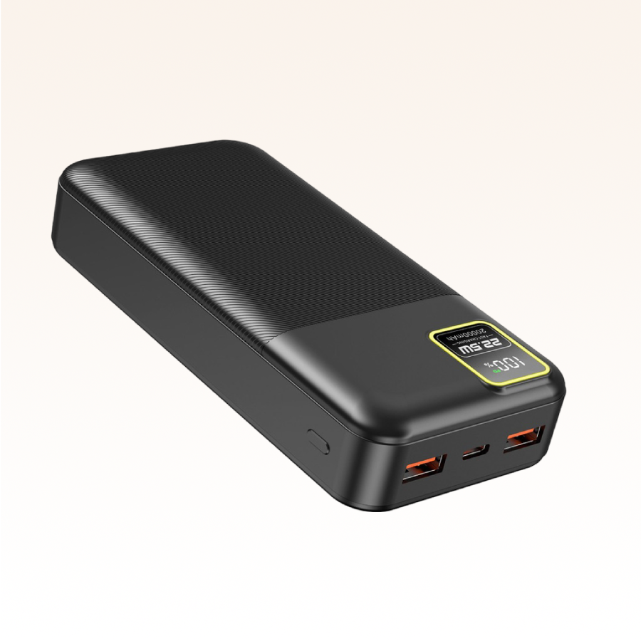 The Porodo Blue Power Bank has a 20000mAh capacity, 20W PD fast charging, dual USB-A QC 3.0 ports, and a digital display—great for quick, reliable charging.