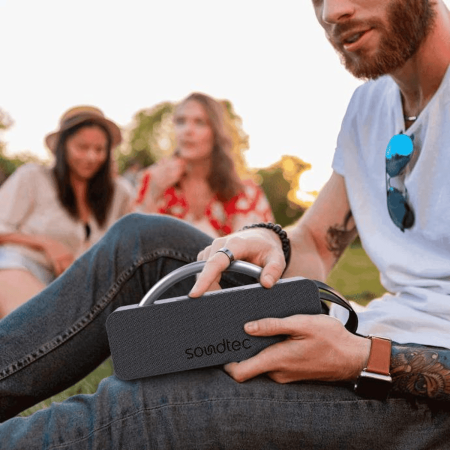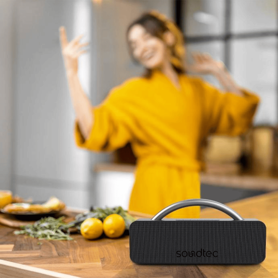 Experience 30W sound and deep bass on the go with this portable speaker—Bluetooth 5.0, FM radio, hands-free calling, IPX5 water resistance, Type-C charging, and 6-hour playtime.