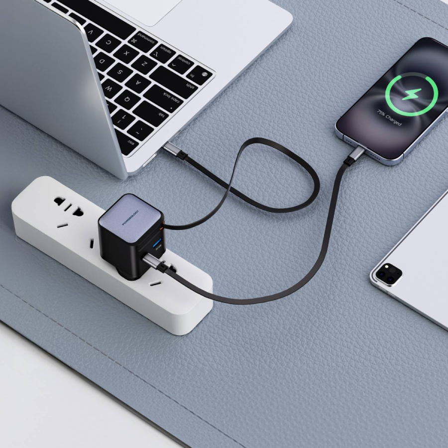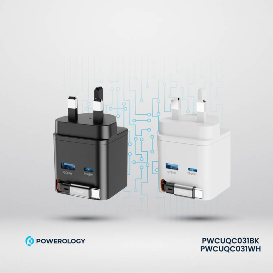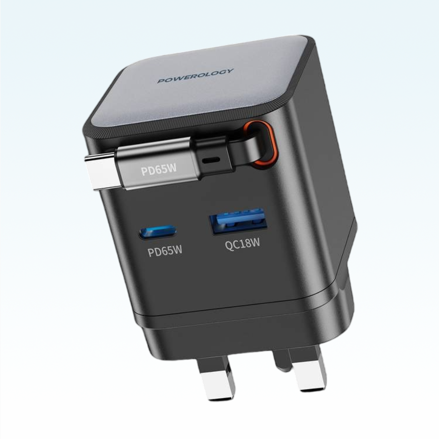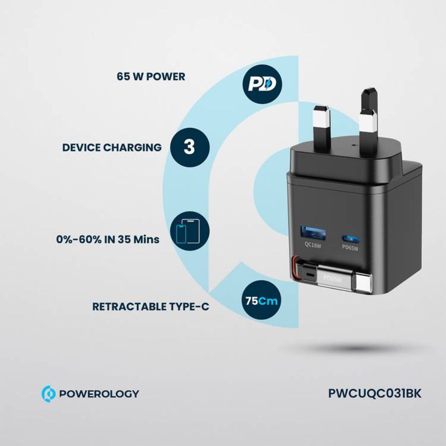 The Powerology Dual Port Retractable GaN Charger is a powerful and compact solution for fast, safe charging. With a total output of 65W, it supports fast charging via USB-C and up to 18W via USB-A, ideal for laptops, tablets, and smartphones. Charge up to three devices at once while staying organized with the 75cm retractable Type-C cable. Made from fireproof matte PC material, it includes built-in protections against overheating, overcharging, and short circuits. Featuring a UK 3-pin plug and patented design, it charges devices from 0% to 60% in just 35 minutes—perfect for home, office, or travel use.