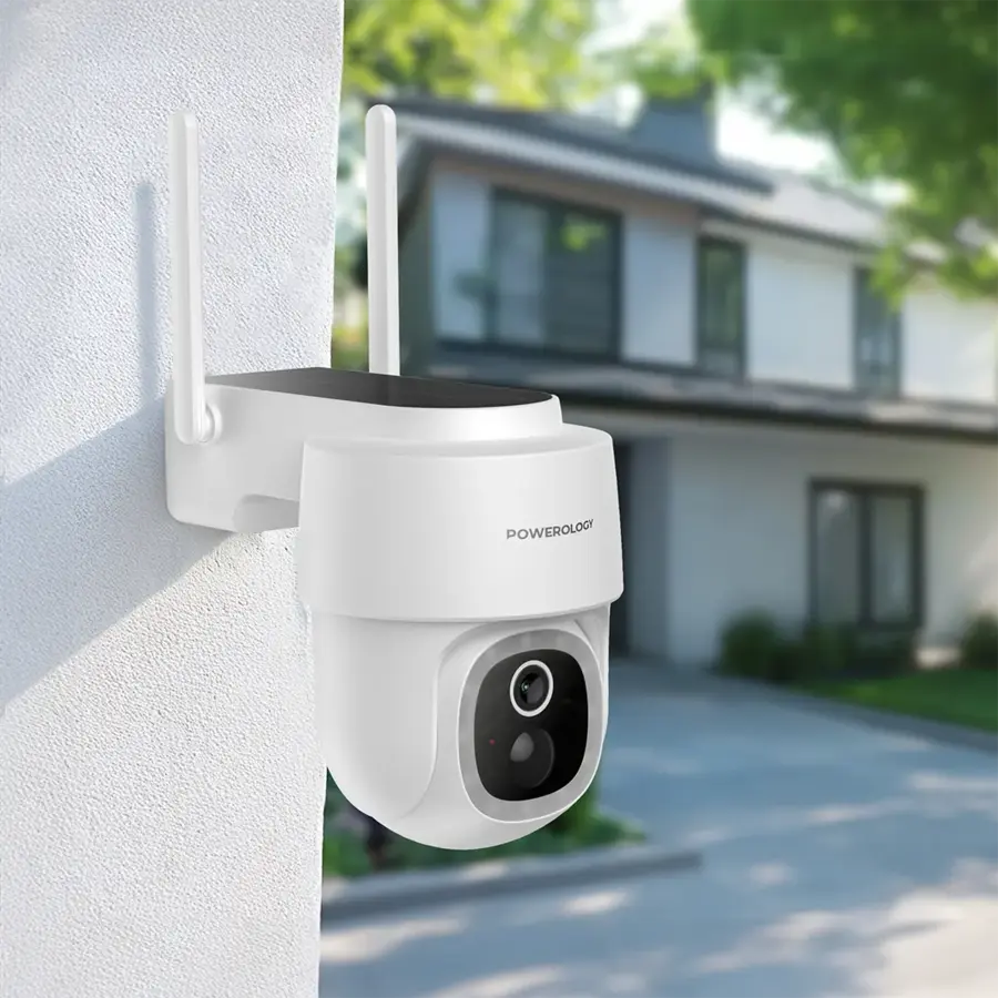 Secure your outdoors with Powerology’s Solar Pan & Tilt Camera – 2304x1269P, 108° wide view, night vision, motion detection, two-way audio, solar 5200mAh battery, IP65 rating, and app control for 24/7 eco-friendly monitoring.